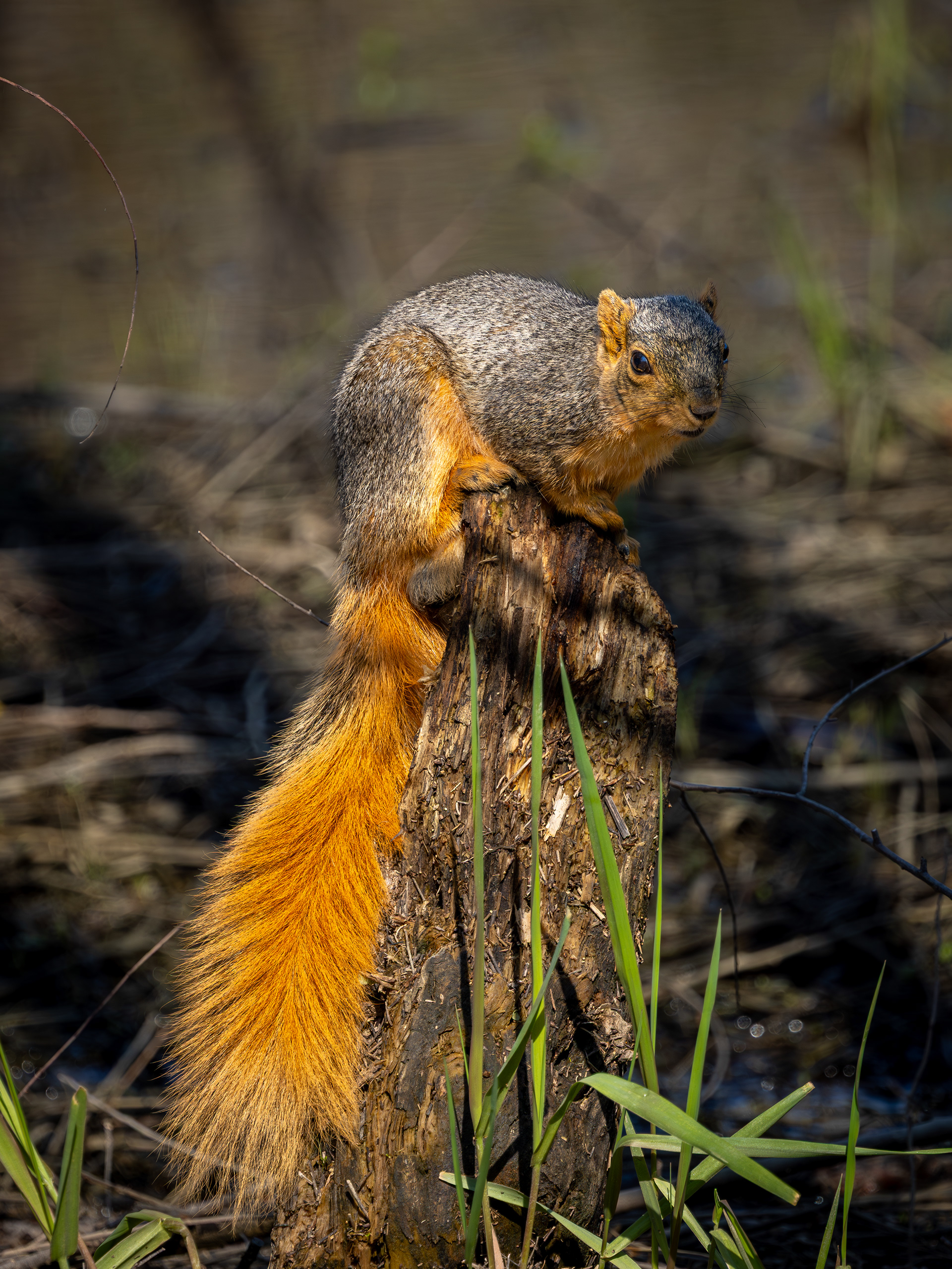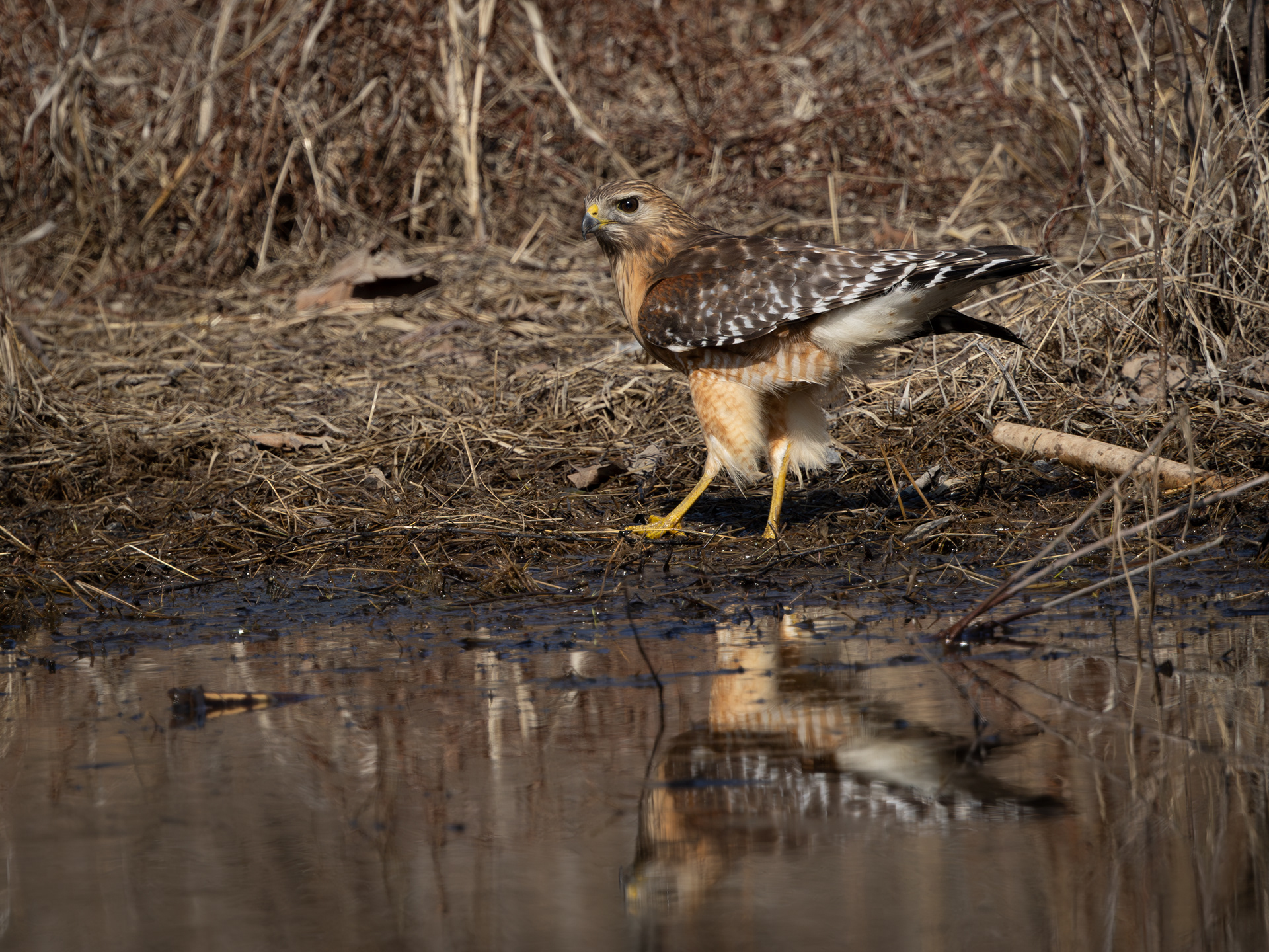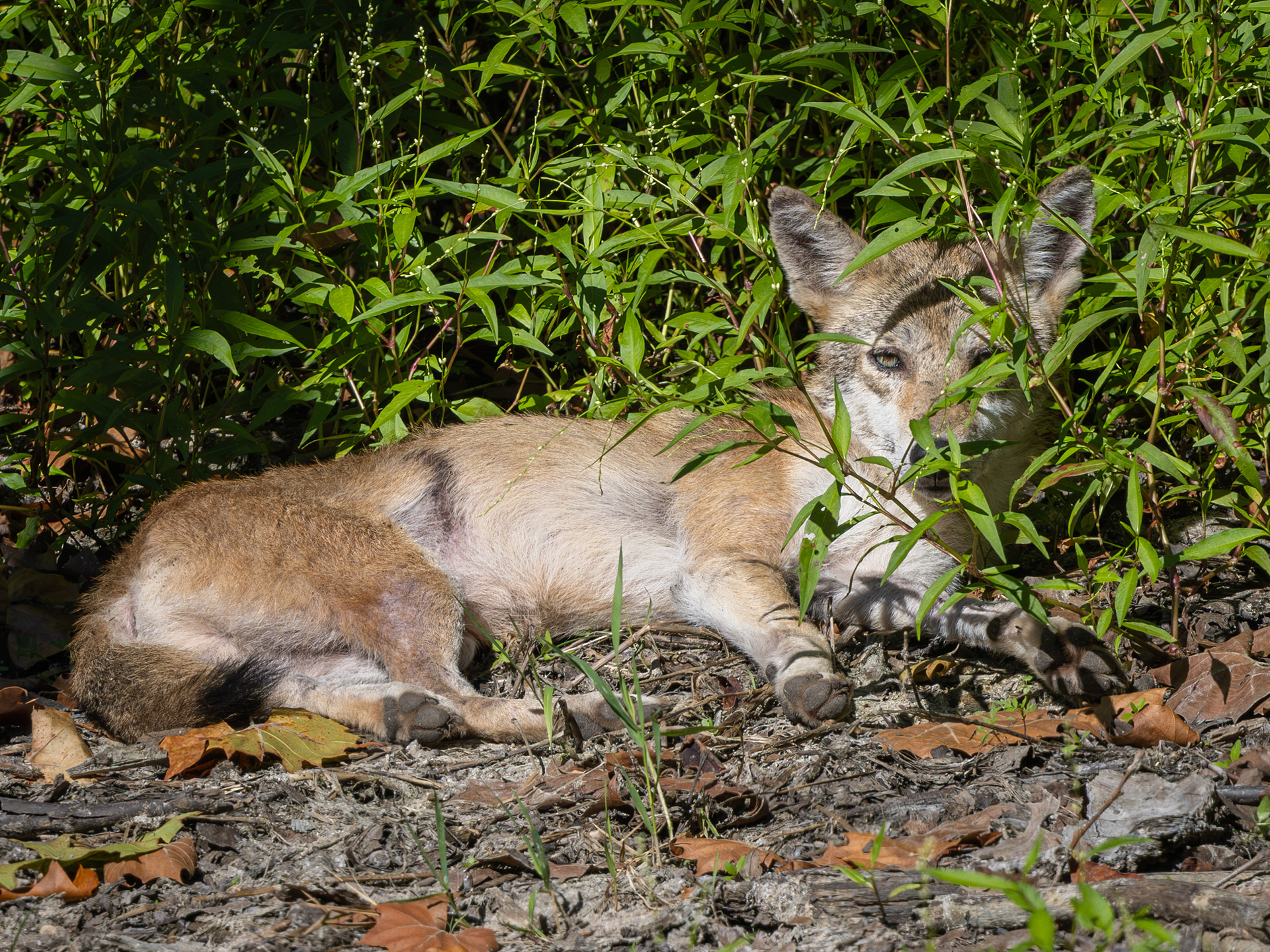 A coyote pup was sunning by the edge of a swamp. I didn't stay too long, as I could hear mama coyote rustling in the brush behind me.