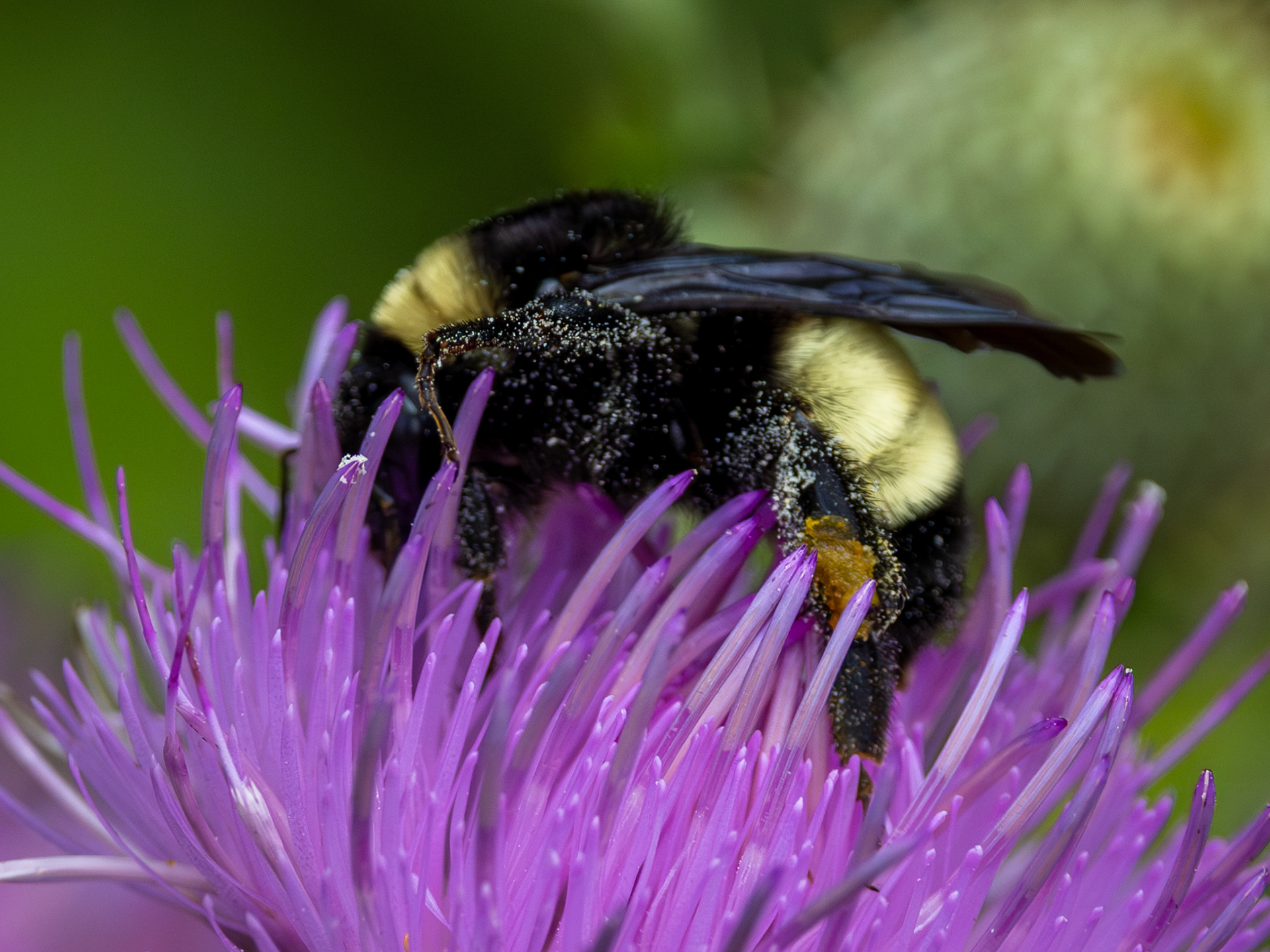 BUMBLEBEE LADEN WITH POLLEN ON A THISTLE