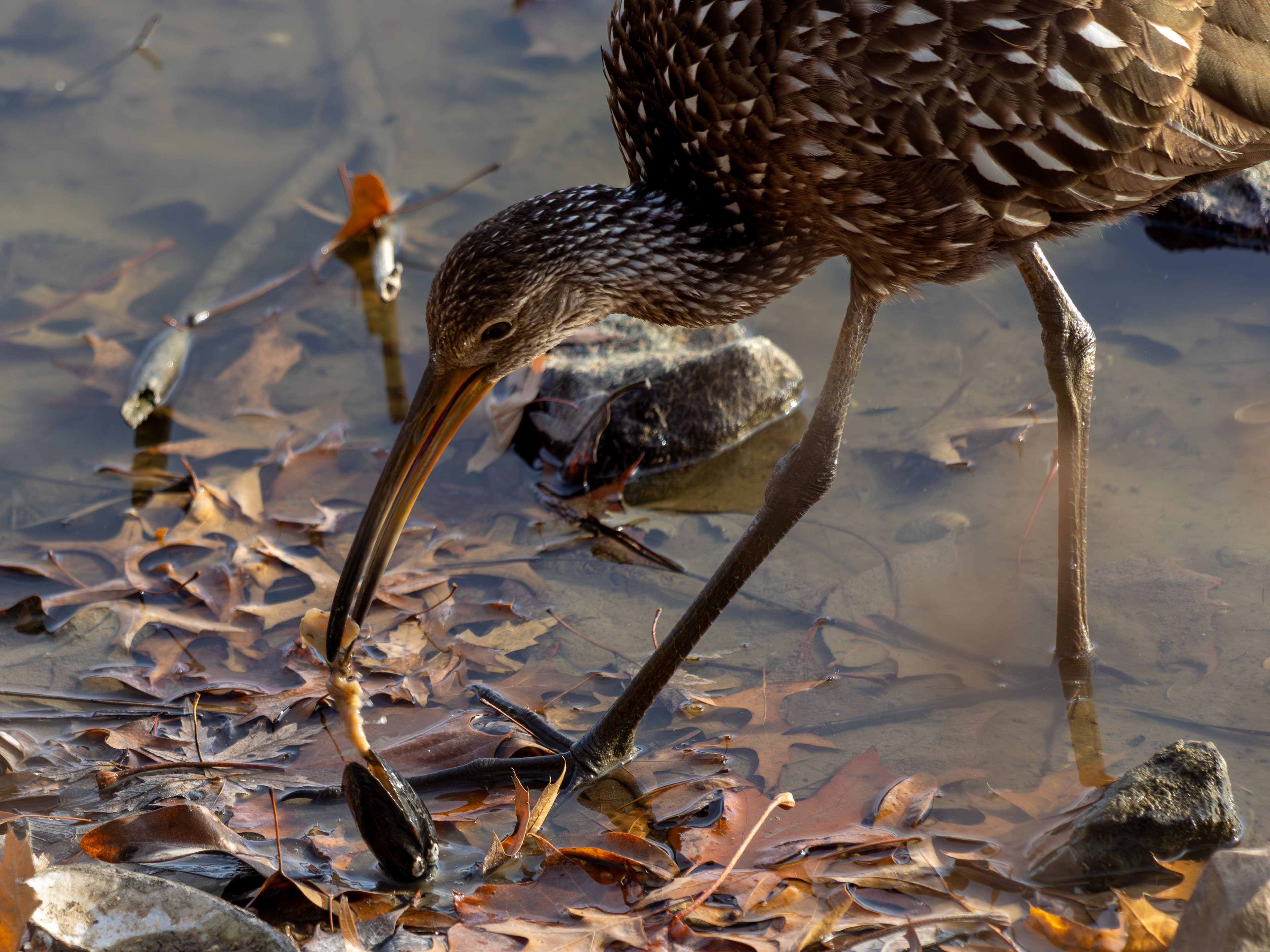 Two photos of a Limpkin eating a mussel at Twin Lakes, Columbia, Mo. It was very rare to see this shorebird so far north — their habitat is normally along the coast of the Gulf of Mexico.