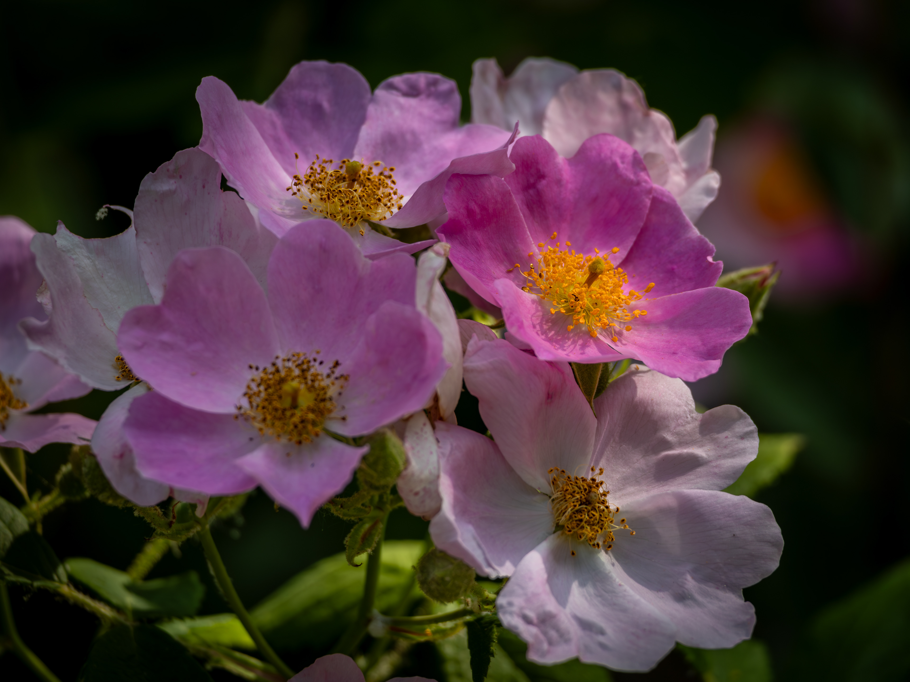 A cluster of multiflora rose blooms in dappled sunlight.