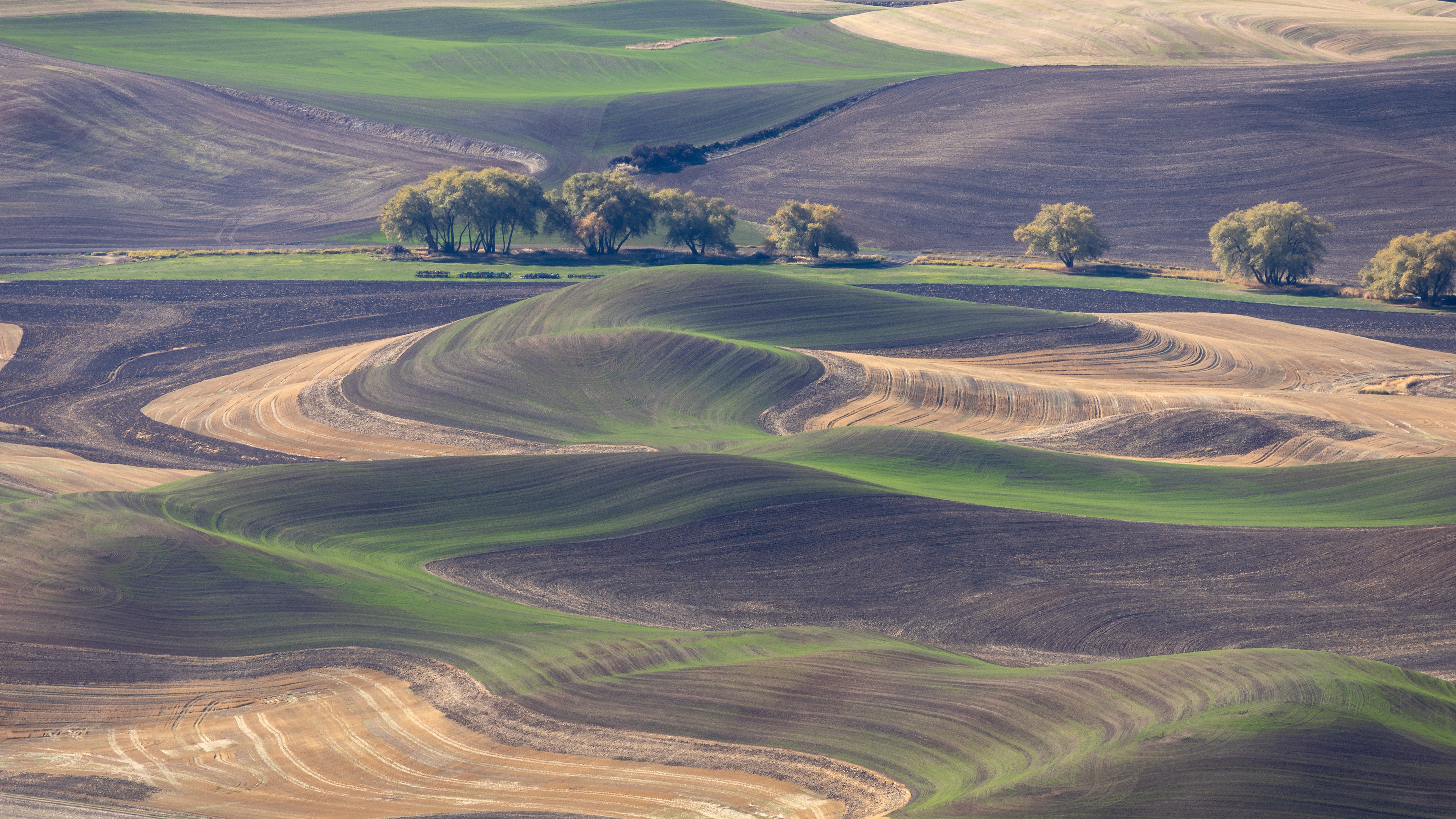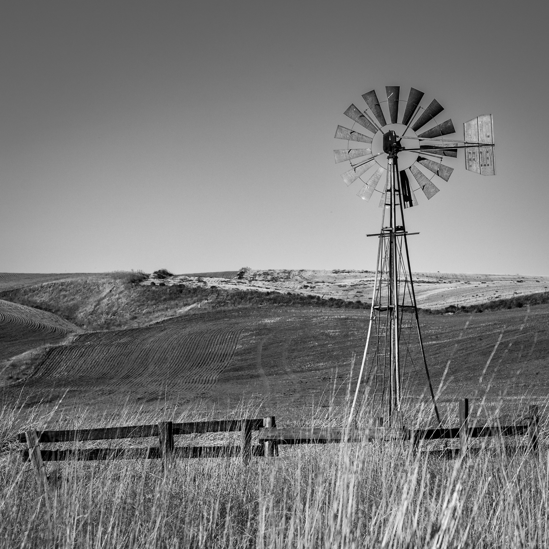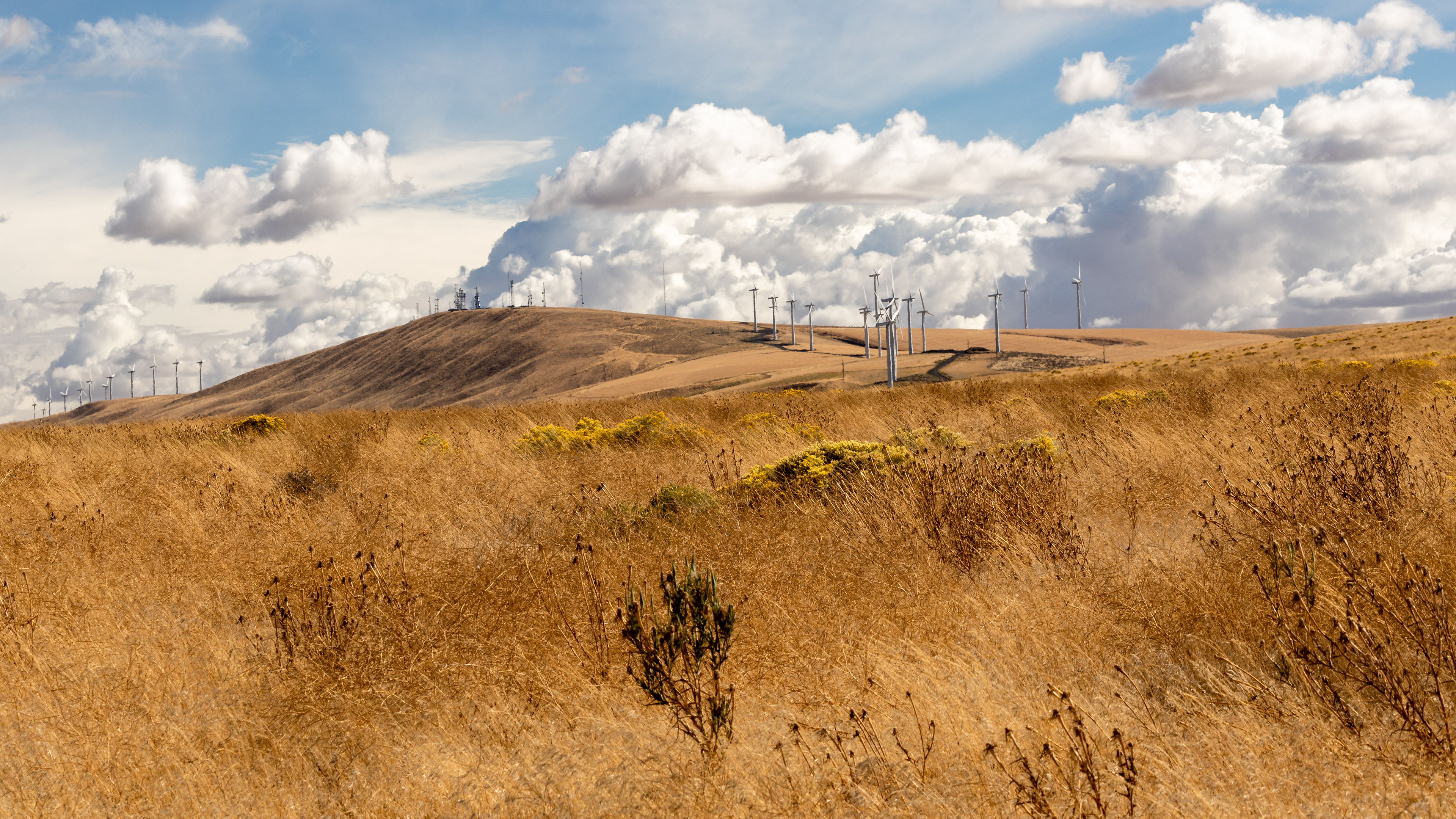 One of my favorites from the rolling prairie in southeastern Washington. The wind turbines stretched past the horizon, where clouds kissed the hilltops. The country road I had followed ended on private property — this was as far as I could go, but it was a great vantage point.