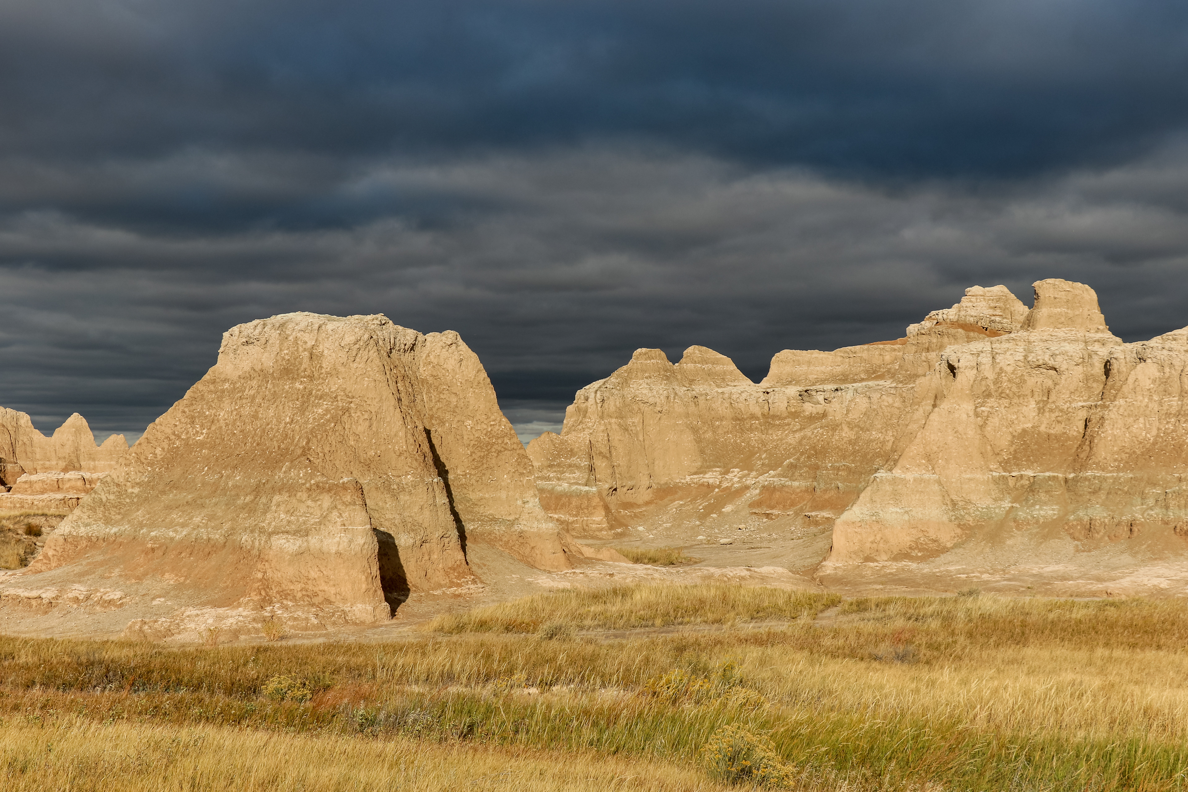 Sunlight highlighted these rock formations as the storm clouds swiftly moved on. South Dakota
